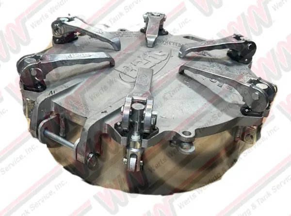 Model 8555 is a 20” full opening cam-latch manhole equipped with a quick opening cast aluminum cover which has a lift handle, two padlock tabs and replaceable nylon wear saddles.  Six smooth-operating aluminum latches attached to robust 5/8” swingbolts are secured to the collar utilizing a single lug design.  The hold-downs are adjustable to create a positive seal between the cover and collar. The cover incorporates innovative safety latches on each side of the handle.  These safety latches will not swing off the cover until the cover is lifted slightly off the collar and residual tank pressure is relieved ensuring a stuck cover will not over-ride the safety mechanism.  Manhole meets requirements of 49CFR §178.345-5 and §178.347-3.